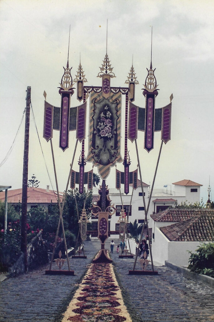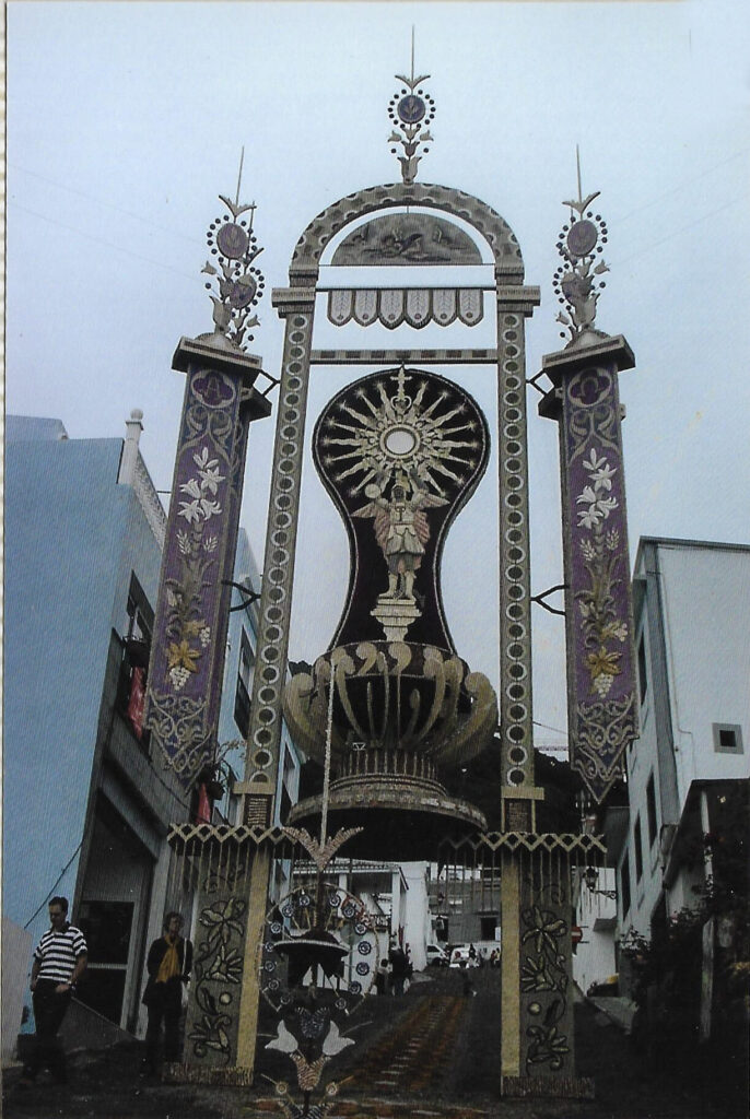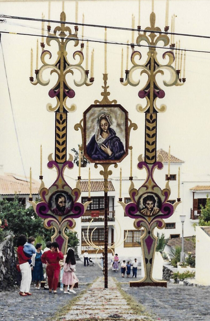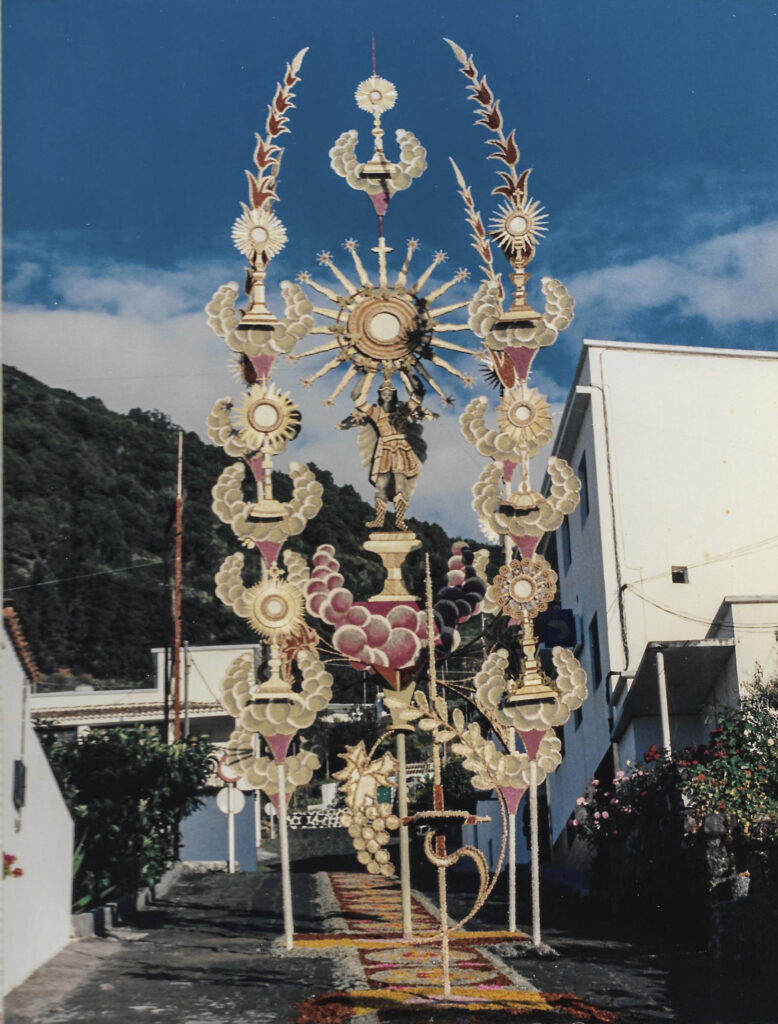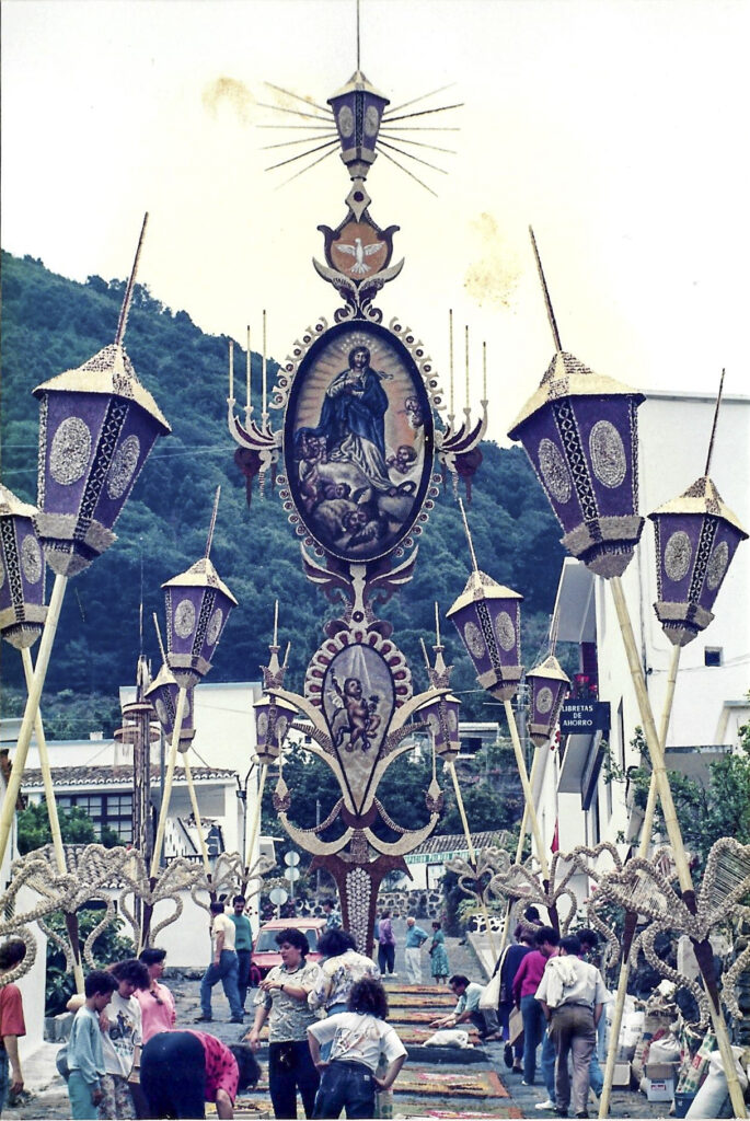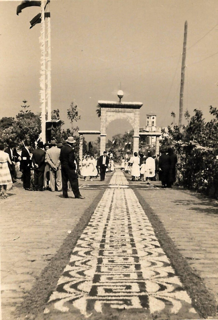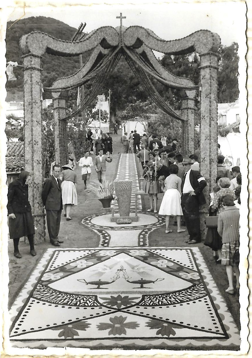 La celebración de la fiesta del Corpus Christi en Villa de Mazo tiene su arranque en 1605, fecha en la que con toda probabilidad se celebró la primera procesión del Corpus Christi en los días posteriores a la solemne colocación del Santísimo Sacramento en el templo de San Blas el 15 de mayo del mismo año. Miramos con vértigo el legado de una tradición que llega al año 2020 con 415 años de historia. Es en 1873 cuando el Corpus empieza a celebrarse con alfombras y pasillos y decorando altares y colocando pañuelos de tela. Según nos cuenta Cirilo Velázquez, en la Historia General del municipio de Villa de Mazo, en el año 1895 aparece por primera vez un gasto municipal relacionado con la confección de un arco para ser colocado en la plaza el día de Corpus Christi. Los vecinos de los diversos barrios participaban en esta fiesta entramando con fayas el camino a recorrer, rivalizando en la colocación de vistosos pañuelos multicolores.