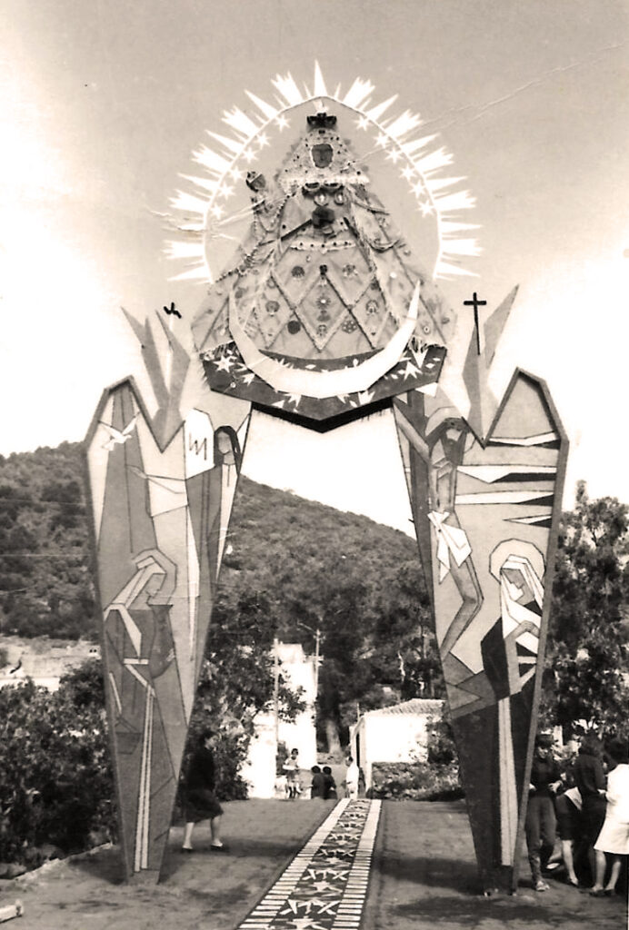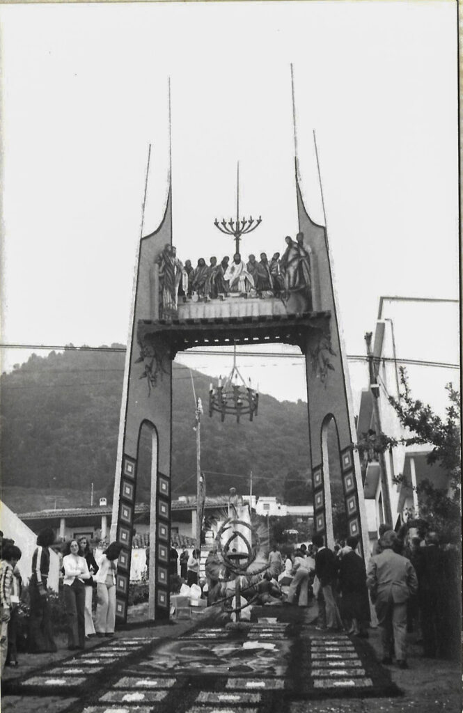 En los años siguientes se instalaron unos “descansos” para que, al paso de la procesión, el Santísimo haga un alto para bendecir a los todos los barrios del municipio. El primer arco vertical tal y como los concebimos hoy, fue confeccionado por los vecinos de La Sabina en el año 1954, construido con dos astas paralelas y a una altura de unos dos metros y medio atravesada por un gran tablón, a modo de dintel, en el que colocaron cuatro palomas y un gran corazón de Jesús, rematado por una cruz y enramado con pétalos. A partir de aquí, los demás barrios fueron sumándose a la celebración y aportando cada uno su arco que con el paso del tiempo han ido evolucionando en forma y tamaño hasta los actuales arcos de Corpus.
