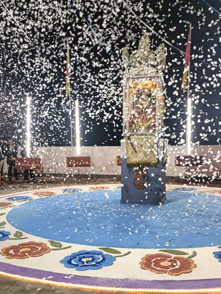 Unas palabras de alabanza y agradecimiento del rector del Real Santuario de Nuestra Señora de las Nieves, D. Fernando Lorenzo Matías, dieron paso a la lectura de un texto por parte de Gloria Pérez Silva en nombre los congregados allí y de todos los que queriendo estar no pudieron estar presentes, para alabar, honrar y agradecer su parada en La Rosa: “Ante este barrio laborioso y unido, se hace festivo y glorioso este instante, dejando una estela de unión y hermandad, de bendiciones y ruegos cumplidos y pedirte que sea perenne tu protección sobre nosotros”(ver texto completo en el anexo).