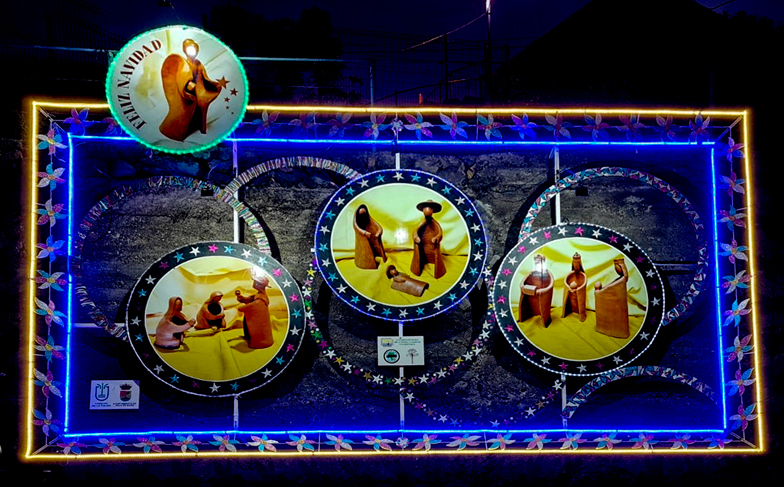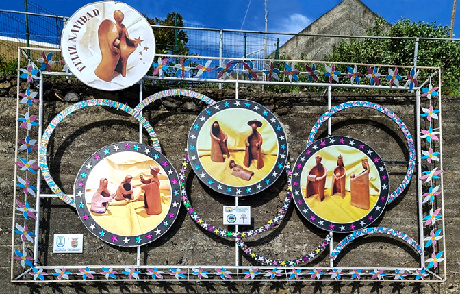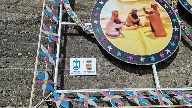 La situación de pandemia por Covid-19 que vivimos ha condicionado todo lo referente a actividades, reuniones, encuentros y demás celebraciones habituales de esta Asociación y con el Nacimiento ha ocurrido lo propio. Por la dificultad para organizar, trabajar conjuntamente y cumplir con el aforo obligatorio en el interior del salón, ha habido que tirar de ingenio y buscar soluciones, por lo que se ha dispuesto un cuadro de gran formato que se ha colocado en la carretera general LP-206, frente a la marquesina de la parada de guaguas, en La Rosa.